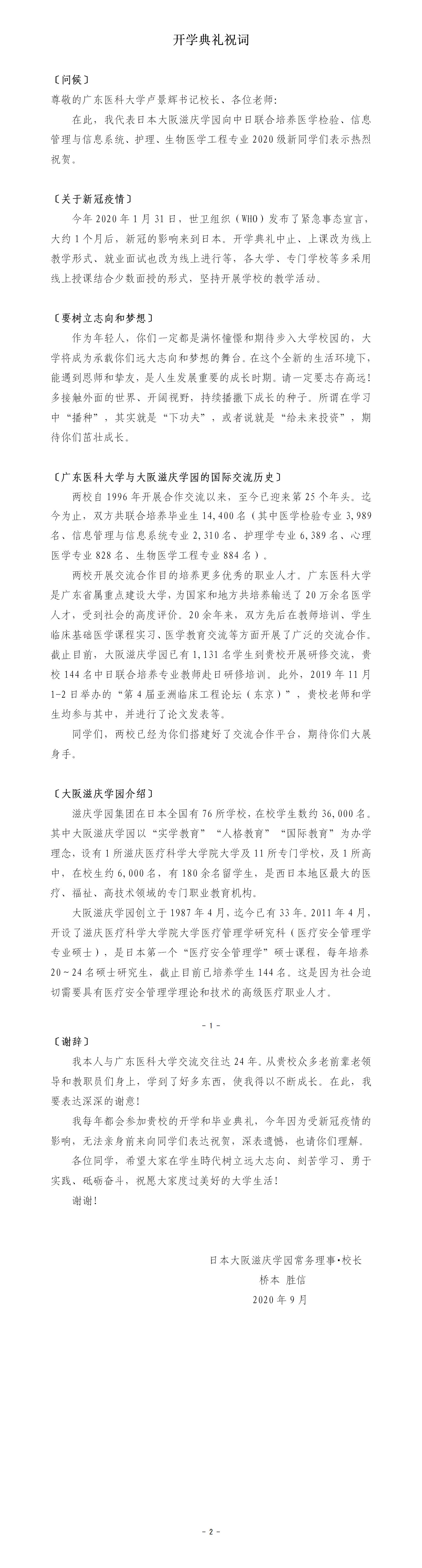 日本大阪滋庆学园常务理事、校长桥本 胜信先生祝贺我校2020级新生开学典礼圆满成功